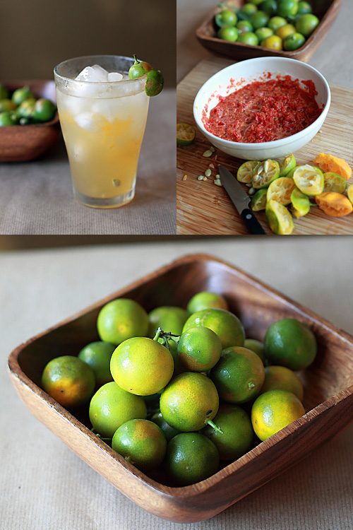 Calamansi (Citrofortunella microcarpa) is a type of citrus that is native to the Philippines. It is also known as calamondin, Panama orange or acid orange. It is very sour hence its popularity as souring agent for sinigang and sawsawan (dipping sauces). It is also one of the more common backyard trees in Philippine homes (along with papaya and guava).